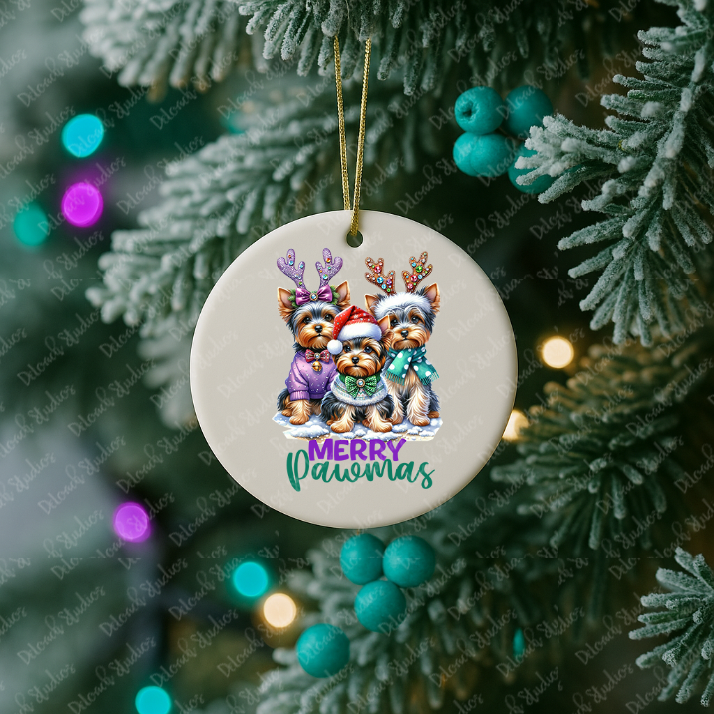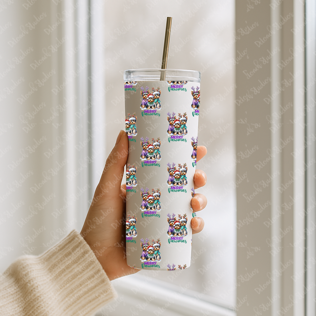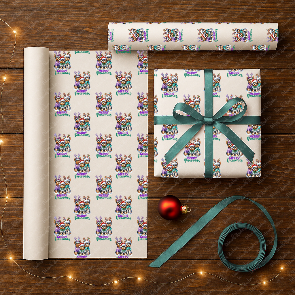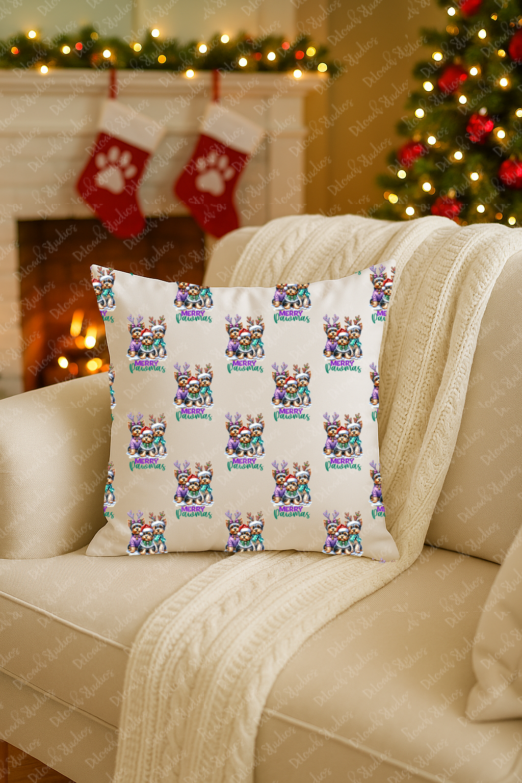 Each item is printed with our exclusive Merry Pawmas design featuring dog characters in coordinating purple, teal, and black Santa outfits.